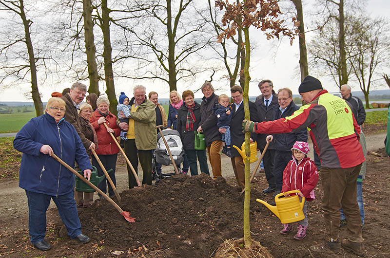 Nachdem der erste Vorsitzende der CDU Schlangen Horst Flüter kurz über das Zustandekommen der Baumpflanzaktion berichtet hatte, erklärte Landrat Friedel Heuwinkel den Werdegang der Sanierung der Fürstenallee. Dann überreichte er den tatkräftigen Forstwirten Ralf Penke und Heiner Mense einen mit Zeilwasser gefüllten „Lippischen Schützen“ als Dankeschön, unter anderem für Ihre „Treffsicherheit“ bei Einhaltung der historischen Pflanzabstände. Jörg Westphal vom Kreis Lippe erläuterte die fachliche Seite der Sanierung, dann wurde von den CDU Mitgliedern zu Maßband, Schaufel und Gießkanne gegriffen. Es ist eine nachhaltige Aktion, wenn die Kinder auf dem Erinnerungsfoto später wiederum ihren Enkelkindern den Baum in der Fürstenallee zeigen werden können. Nach Abschluss der Pflanzaktion sollen die Bäume gekennzeichnet oder auf einer Tafel verzeichnet werden.
